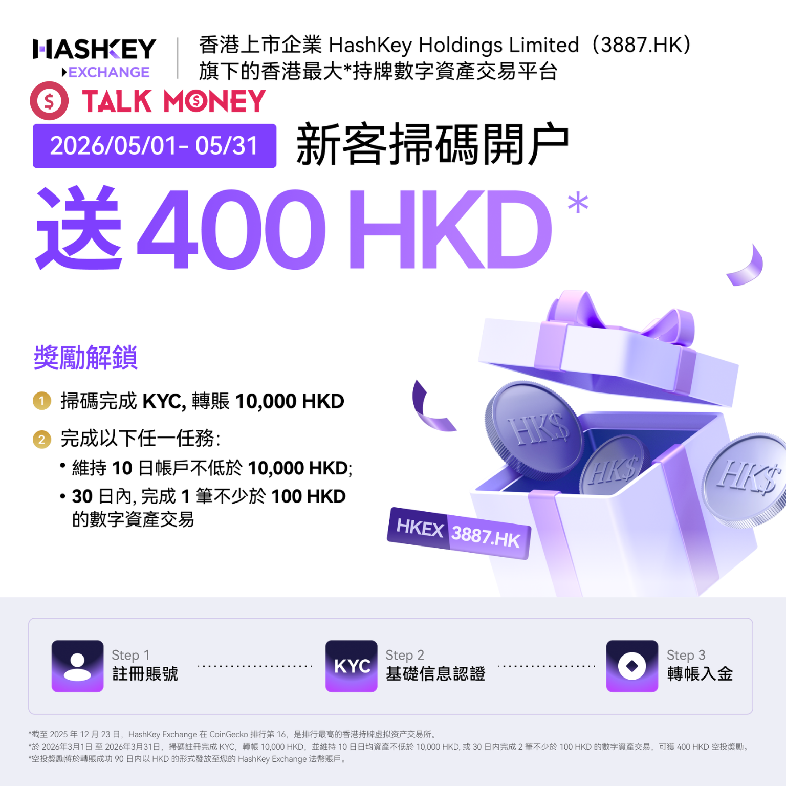 - 送$400現金券完成線上開戶首次存入 HK$10,000及保存10日或30日內完成1筆不少於 100 HKD 的數字資產交易