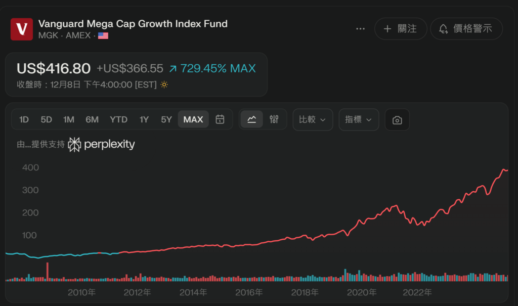 - MGK (Vanguard Mega Cap Growth ETF) 專門投資於美國市值最大、最具增長潛力的超級龍頭股。