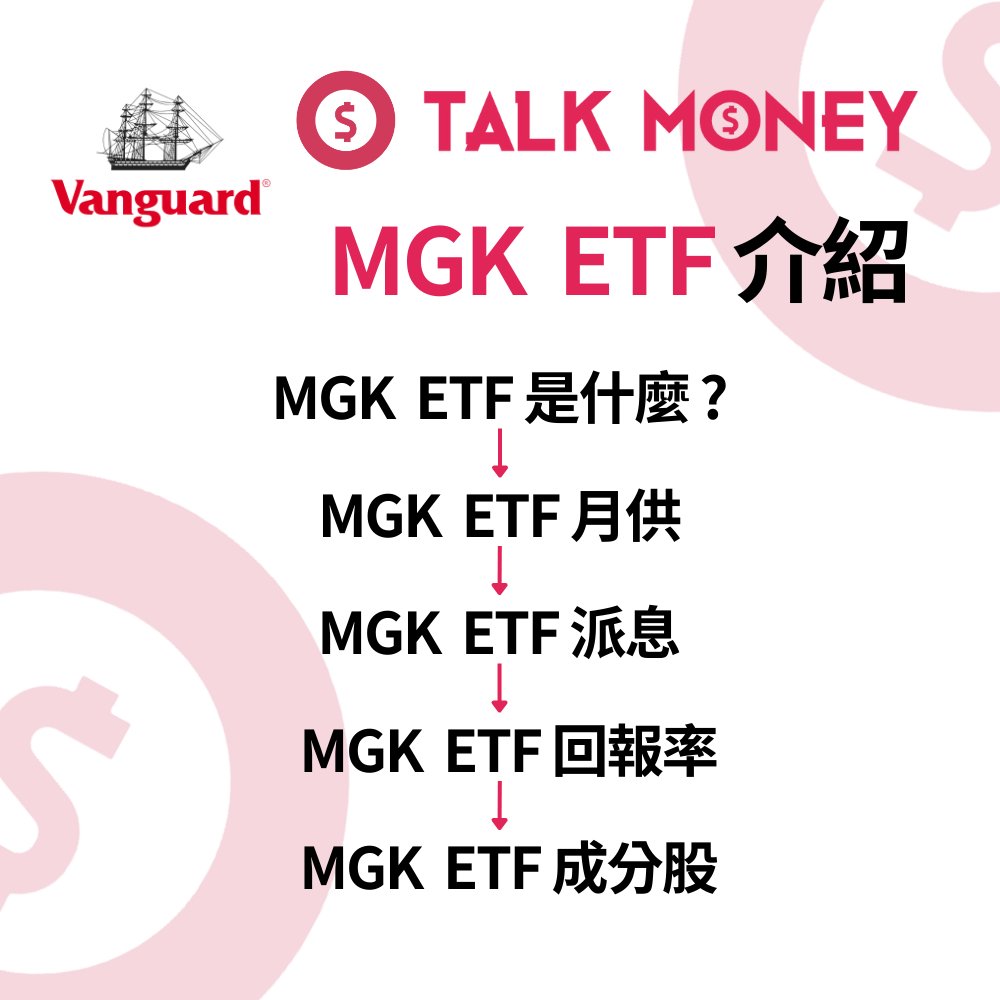 MGK ETF(Vanguard Mega Cap Growth ETF)專注投資美國最大型嘅增長股,重點集中科技、通訊服務同消費科技龍頭,例如 Apple、Microsoft、NVIDIA、Amazon 等。MGK 好啱香港投資者用嚟捕捉美股長線增長動力,基金費用低、流動性高,同時跟蹤大型增長企業,增長潛力強。想參與 AI、雲端、半導體等未來趨勢,MGK 係值得留意嘅 ETF 選擇。