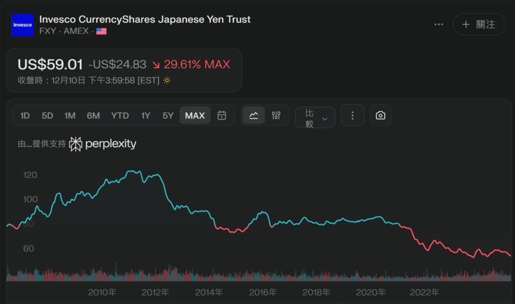 - FXY ETF(Invesco CurrencyShares Japanese Yen Trust)係單一貨幣ETF,2007年成立,專注追蹤日元兌美元匯率,持有實物日元儲備,避開紙幣風險。