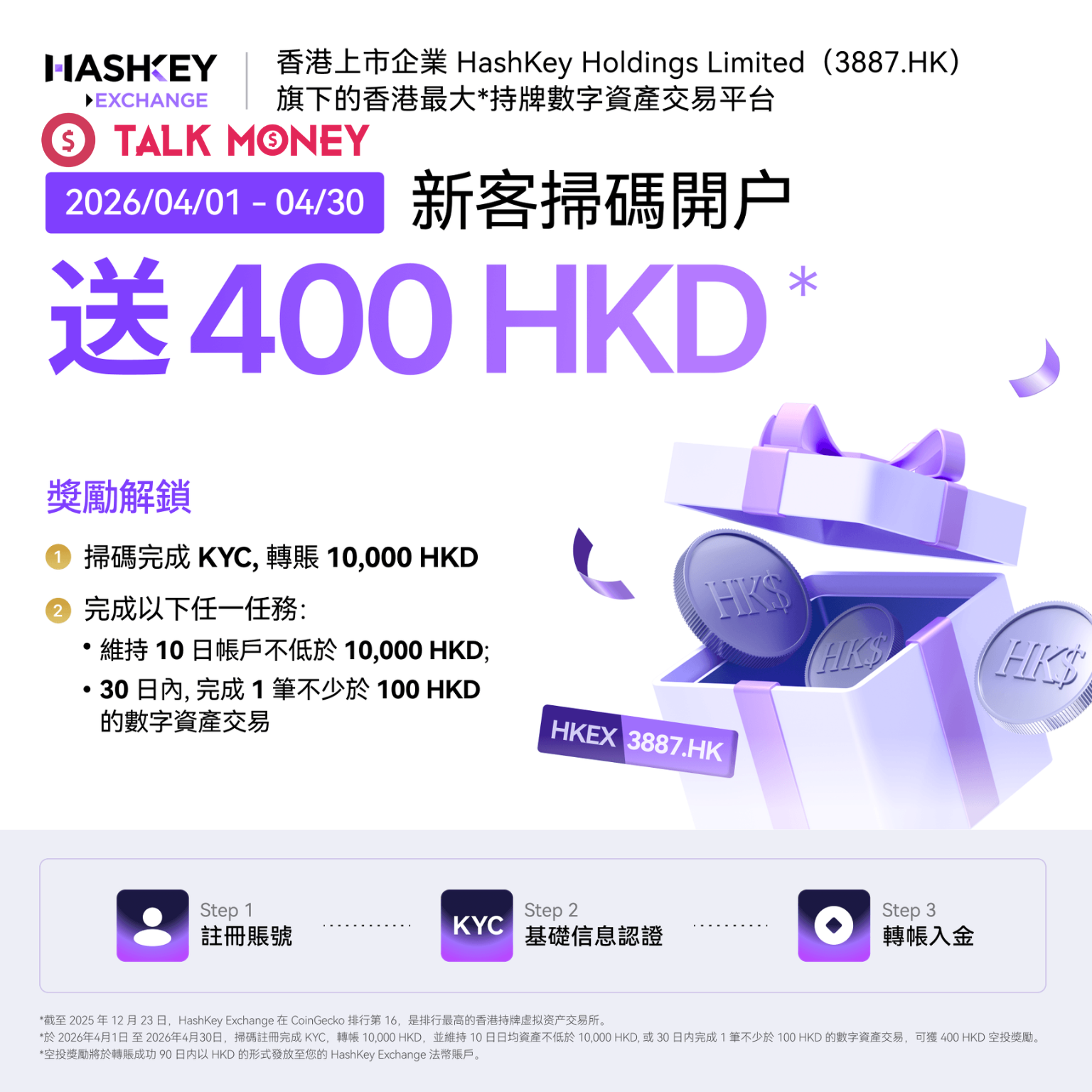 【2026最新】HashKey迎新優惠震撼登場!1️⃣經【TalkMoney】專屬連結開戶,2️⃣使用HashKey優惠碼【TALK88】,3️⃣首次入金$10000及保存10日或30日內完成1筆不少於 100 HKD 的數字資產交易即送迎新總值達$400現金券獎勵,輕鬆開戶即慳錢